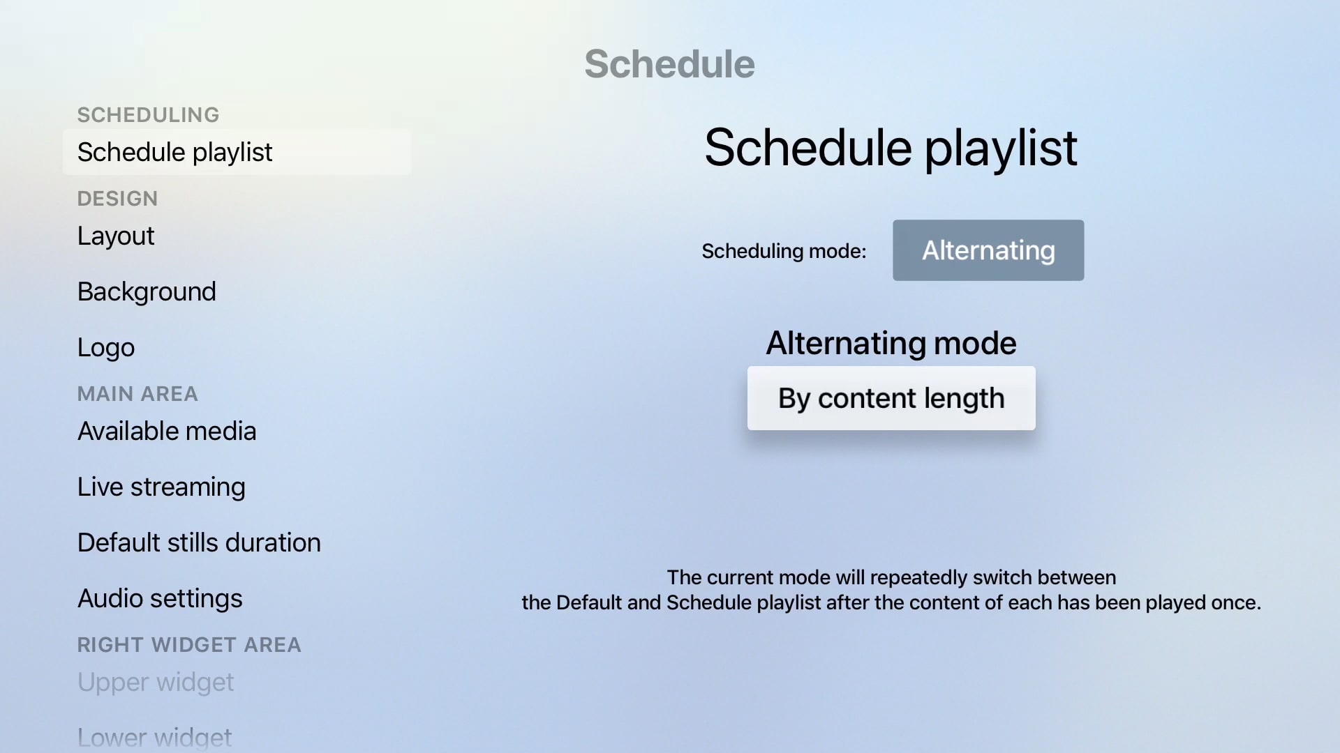 Sigmondo has a default playlist and a schedule playlist. You can fill the second playlist with different content. Easily define start and stop time. Or use alternate by a defined length or by the length of the playlists. That’s it!