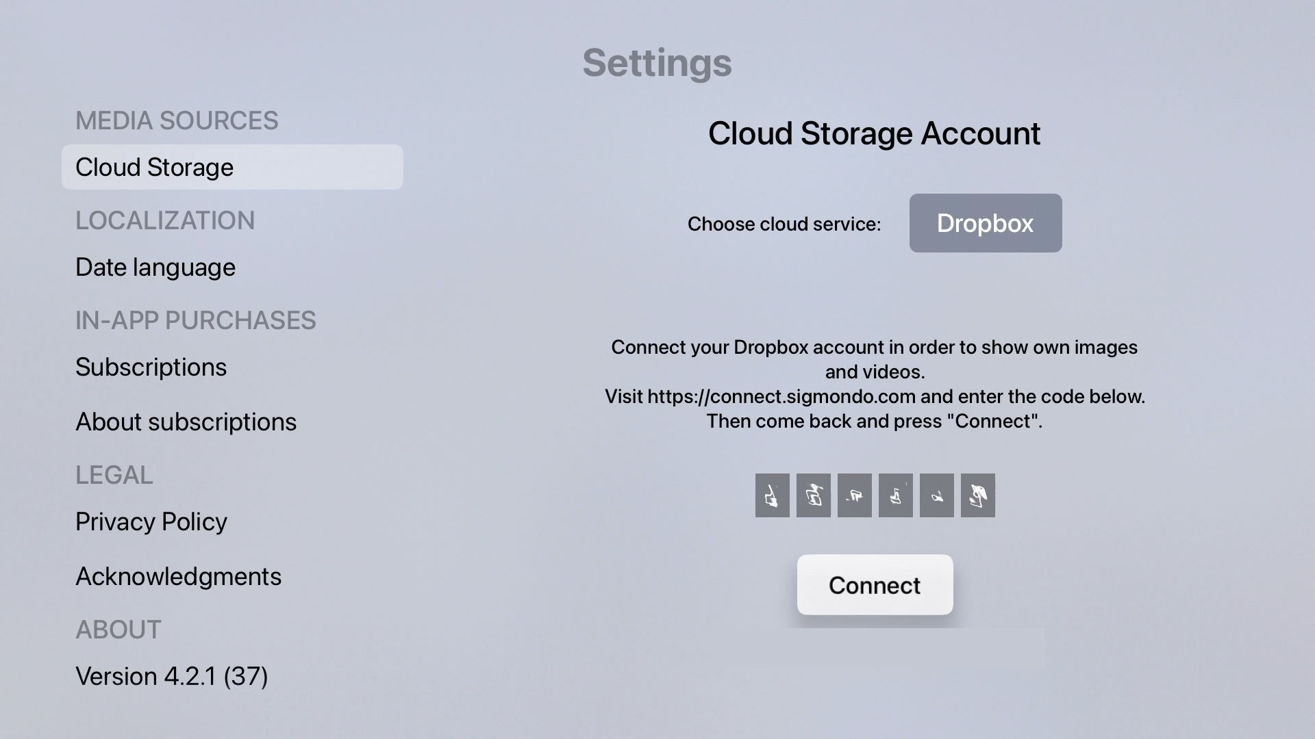 - Allow the Sigmondo app on your Apple TV to access your Dropbox or OneDrive folder via a simple one time only link.